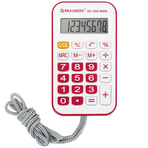 Калькулятор карманный со шнурком BRAUBERG DC-109-WWR (61x110 мм), 8 разрядов, БЕЛЫЙ/КРАСНЫЙ, 272644