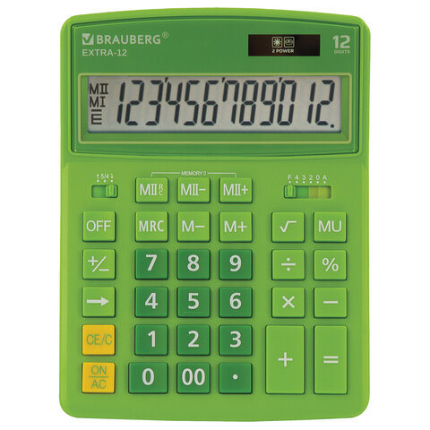 Настольный калькулятор BRAUBERG EXTRA-12-DG. Большой дисплей с увеличенным углом обзора, устойчивый корпус и клавиатура с цветной дифференциацией для эффективной работы с максимальным комфортом. Калькулятор производит все основные арифметические действия: возведение в степень, вычисления с процентами, извлечение квадратного корня. Незаменим для бухгалтеров благодаря наличию клавиш двойной памяти, «00» и MU для расчетов налогов и торговой наценки. Переключатели округления и положения десятичного знака позволяют производить нужные настройки. Большой двенадцатиразрядный дисплей отображает большие значения с высокой точностью округления. Встроенный аккумулятор и солнечная батарея позволяют калькулятору работать при любом освещении, а клавиша выключения OFF и функция автоматического отключения (через 8-10 минут бездействия) позволяют максимально продлить срок его службы без замены батареи.Размер - 206x155 мм. Гарантия 10 лет.