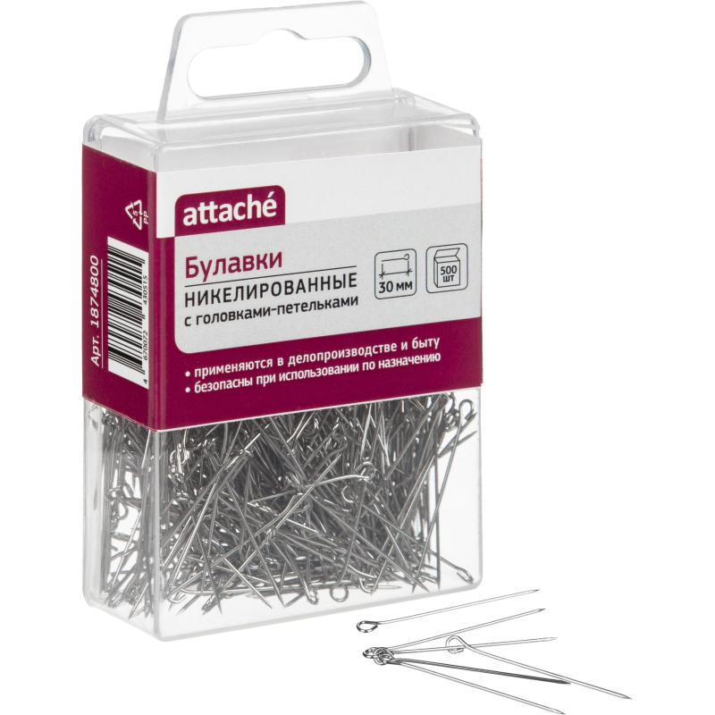 Булавки универсальные с гол.петель. ник. Attache, 30 мм, 500 штук, в пласт кор
