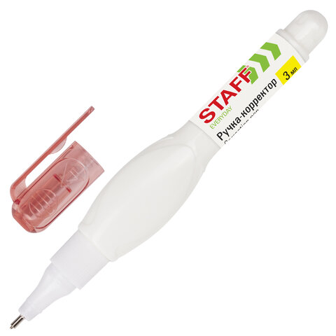 Компактная ручка-корректор STAFF предназначена для исправлений текста на любых типах бумаги. Быстросохнущий корректор мини-формата (объем 3 мл) на спиртовой основе легко помещается в пенал или карман. Морозоустойчивый. Надежный металлический наконечник. Клапанный механизм ручки предотвращает самопроизвольное вытекание: подача жидкости осуществляется с помощью нажатия на наконечник. На корпус ручки не следует оказывать повышенное физическое давление, за исключением случаев, когда ручкой давно не пользовались. Перед началом использования ОБЯЗАТЕЛЬНО встряхните ручку.