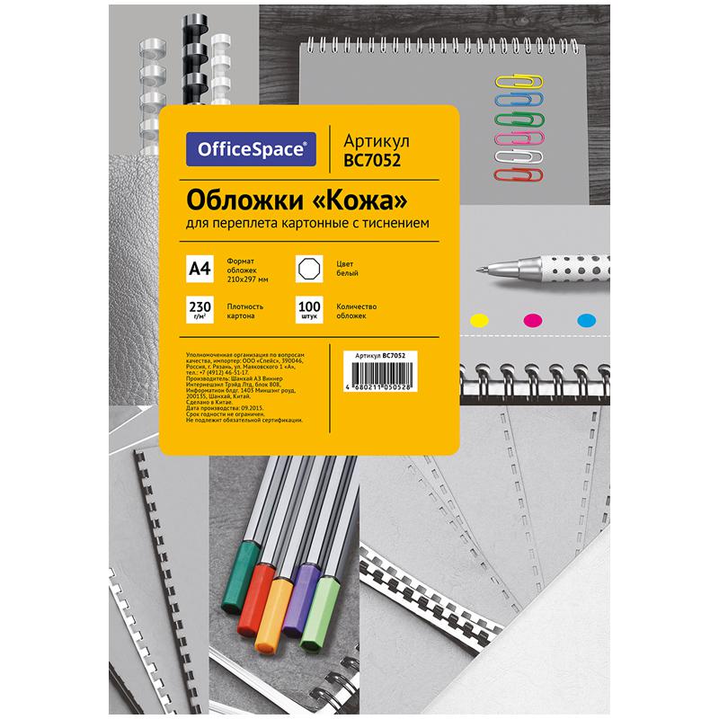 Обложка А4 OfficeSpace "Кожа" 230г/кв.м белый картон 100л.: BC7052 Обложка для переплета предназначена для оформления документов. Выполнена из картона белого цвета с тиснением под кожу. Идеально подходит как для переплета на пластиковую, так и на металлическую пружины.