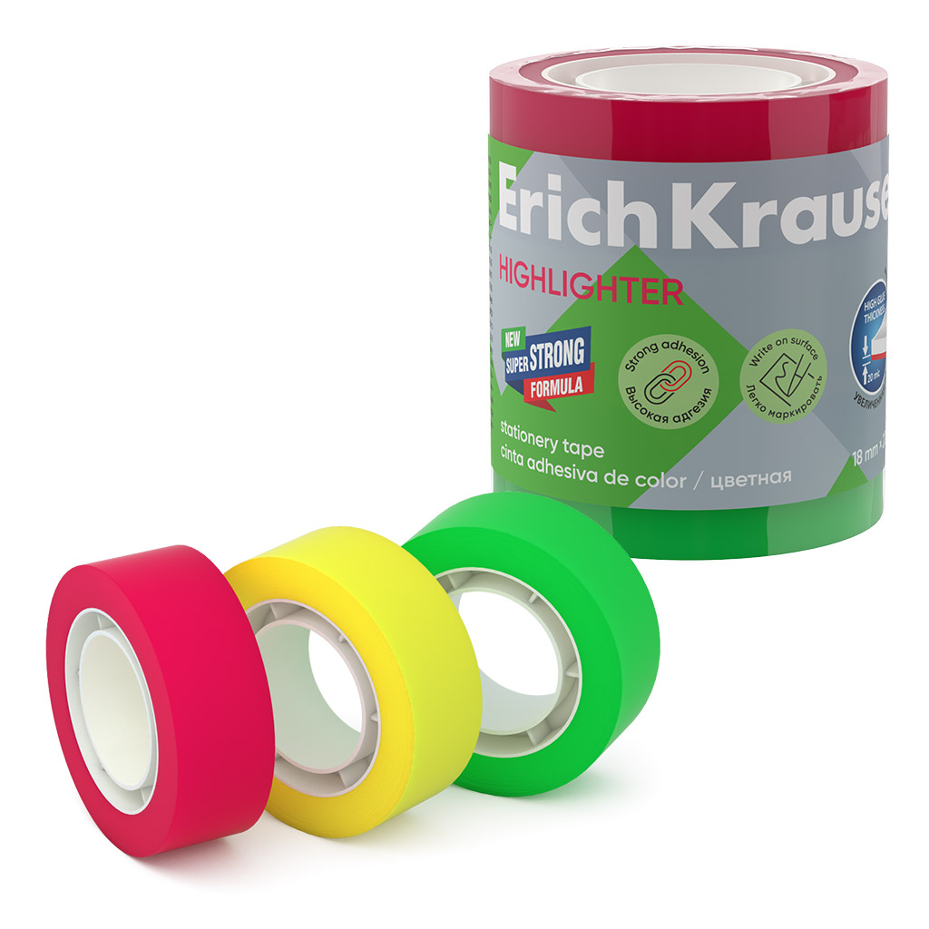 Набор из 3 клейких лент ErichKrause Highlighter, прозрачная, цветная, 18ммх20м, ассорти (в пленке)