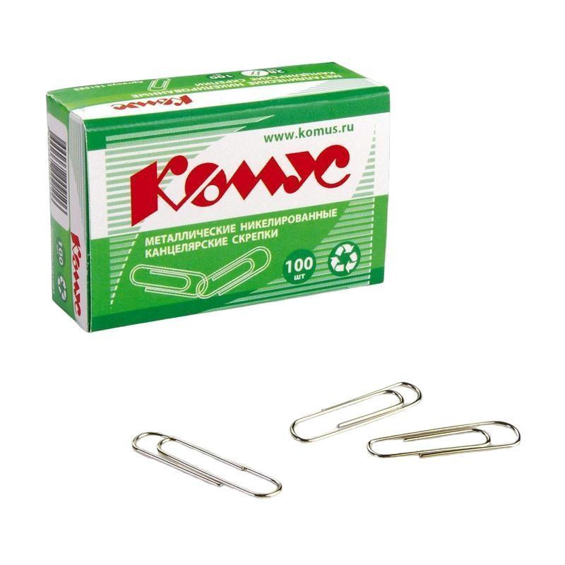 Скрепки КОМУС никелированные, 28 мм, негофрированные, 100 шт/уп