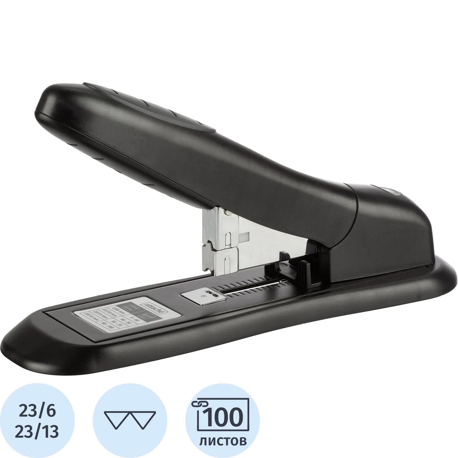 Мощный степлер с максимальной толщиной сшивания бумаги до 100 листов. Глубина закладки листов составляет 60 мм. Основа степлера, выполненная из металла, пластика и резины, не царапает поверхность стола и предотвращает скольжение. Тип и размер используемых скоб: N23/6, 23/8, 23/10, 23/13. Загрузка скоб в степлер осуществляется фронтально. Для эффективного сшивания максимально допустимого объема бумаги необходимо расположить степлер на горизонтальной твердой поверхности, прикладывая усилия, плавно надавить на рычаг (при необходимости двумя руками), разномерно распределяя усилия по поверхности рычага.