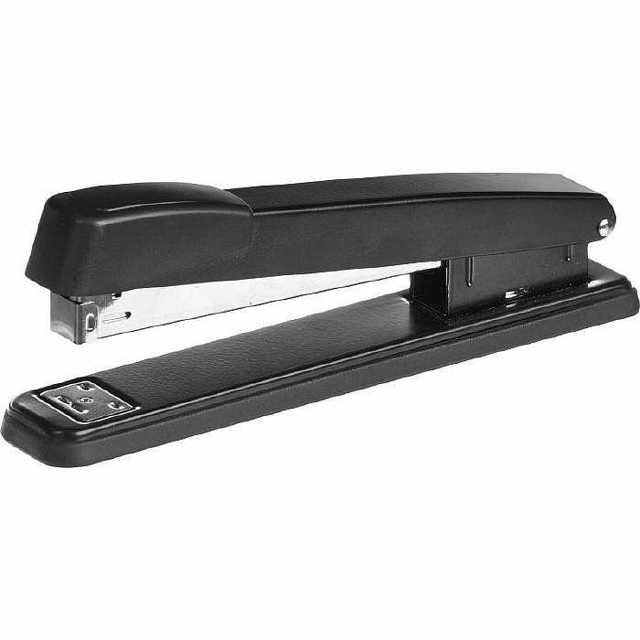 Степлер металлический одновременно сшивает до 30 листов плотностью 80 г/кв.м. Позволяет производить сшивание открытым и закрытым способом. Глубина закладки бумаги - 125 мм (12,5 см). Металлический степлер выполнен в черном цвете. В степлере используются скобы №- 24/6, 26/6.