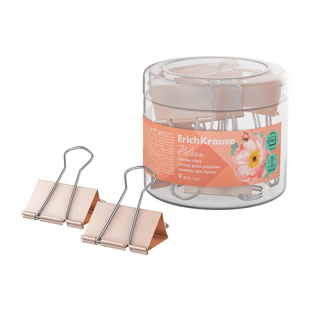 Зажимы для бумаг Erich Krause Pastel Bloom, 32 мм, Peach (в пластиковой коробке, 9 штук)