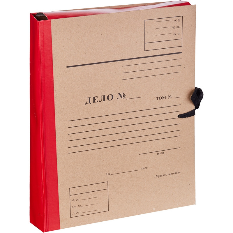 Архивная папка «Дело №-» формата А4 выполнена из плотного картона, обтянутого крафт-бумагой красного цвета. Корешок шириной 5 см - из бумвинила (слой ПВХ на бумажной основе). В закрытом виде фиксируется с помощью четырех завязок. Вмещает до 350 листов стандартной плотности.