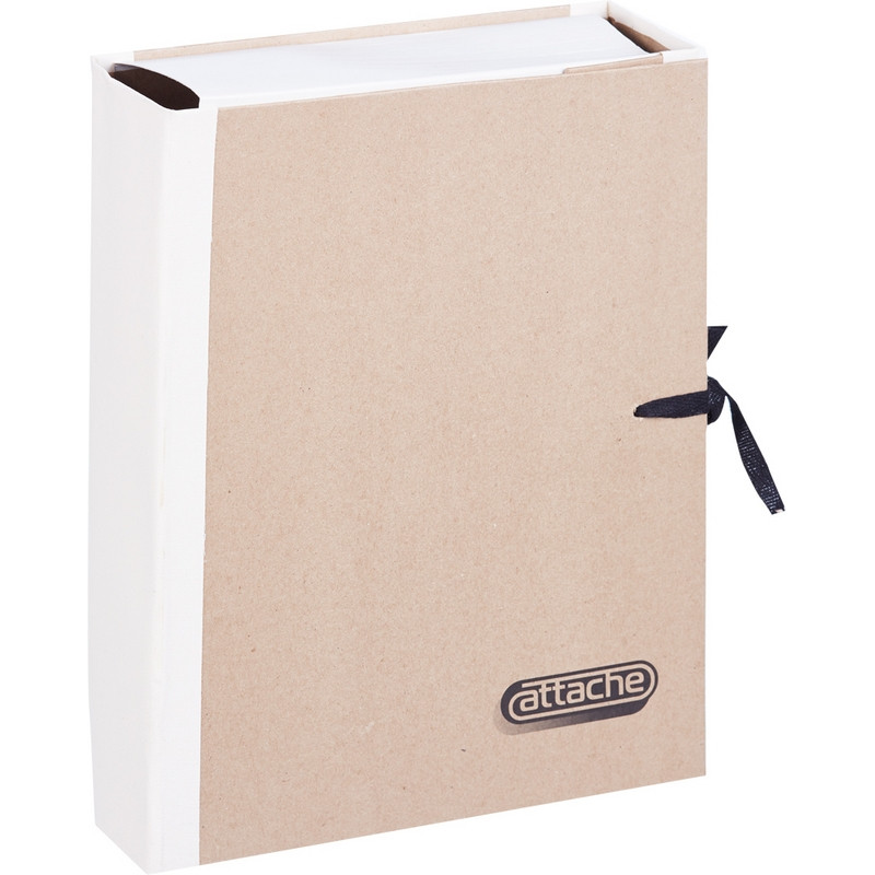 Архивная папка Attache формата А4 выполнена из плотного картона, обтянутого крафт-бумагой. Корешок шириной 8 см - из коленкора (переплетная хлопчатобумажная ткань). В закрытом виде фиксируется с помощью четырех завязок. Вмещает до 600 листов стандартной плотности.