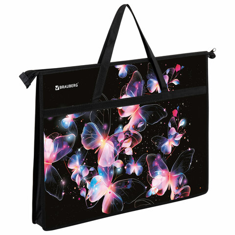 Папка BRAUBERG "Butterflies" предназначена для хранения чертежей, рисунков и других художественных изображений. Практичная папка на молнии с ручками защитит чертежи, рисунки и другие художественные изображения формата А3 от смятия и повреждений. Изготовлена из износостойкого пластика, боковины выполнены из прочного полиэстера. Яркая и чёткая печать дизайна нанесена с двух сторон. Размер папки — 340х465 мм, ширина – 50 мм. Широкий формат позволяет разместить внутри канцелярские принадлежности для творчества. Папка оснащена удобной застёжкой-молнией сверху.Прочные ручки, изготовленные из тесьмы и надёжно прикреплённые к папке, обеспечивают комфортную переноску даже при большой нагрузке. Индивидуальная упаковка – полиэтиленовый пакет с европодвесом – защищает товар при транспортировке и позволяет удобно разместить его для покупателей.
