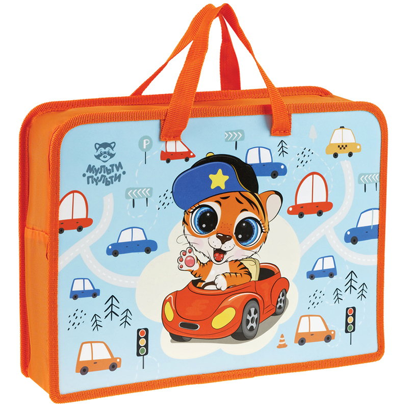 Папка с ручками «Мульти-Пульти» серия «Tiger» формата А4 для удобного хранения листов А4, тетрадей, альбомов для рисования. Папка изготовлена из качественного пластика, который защищает содержимое папки от влаги. Удобные ручки позволяют взять ее в школу, детский сад. Широкая боковая часть (75 мм) увеличивает вместимость папки, благодаря чему помещается стакан-непроливайка. Для детей старше 3-х лет. • Формат: А4, • Ширина папки: 75 мм.