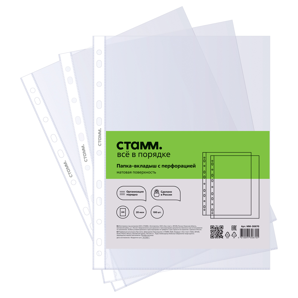 Папка-вкладыш с перфорацией (файл) СТАММ А4, 20мкм, матовая