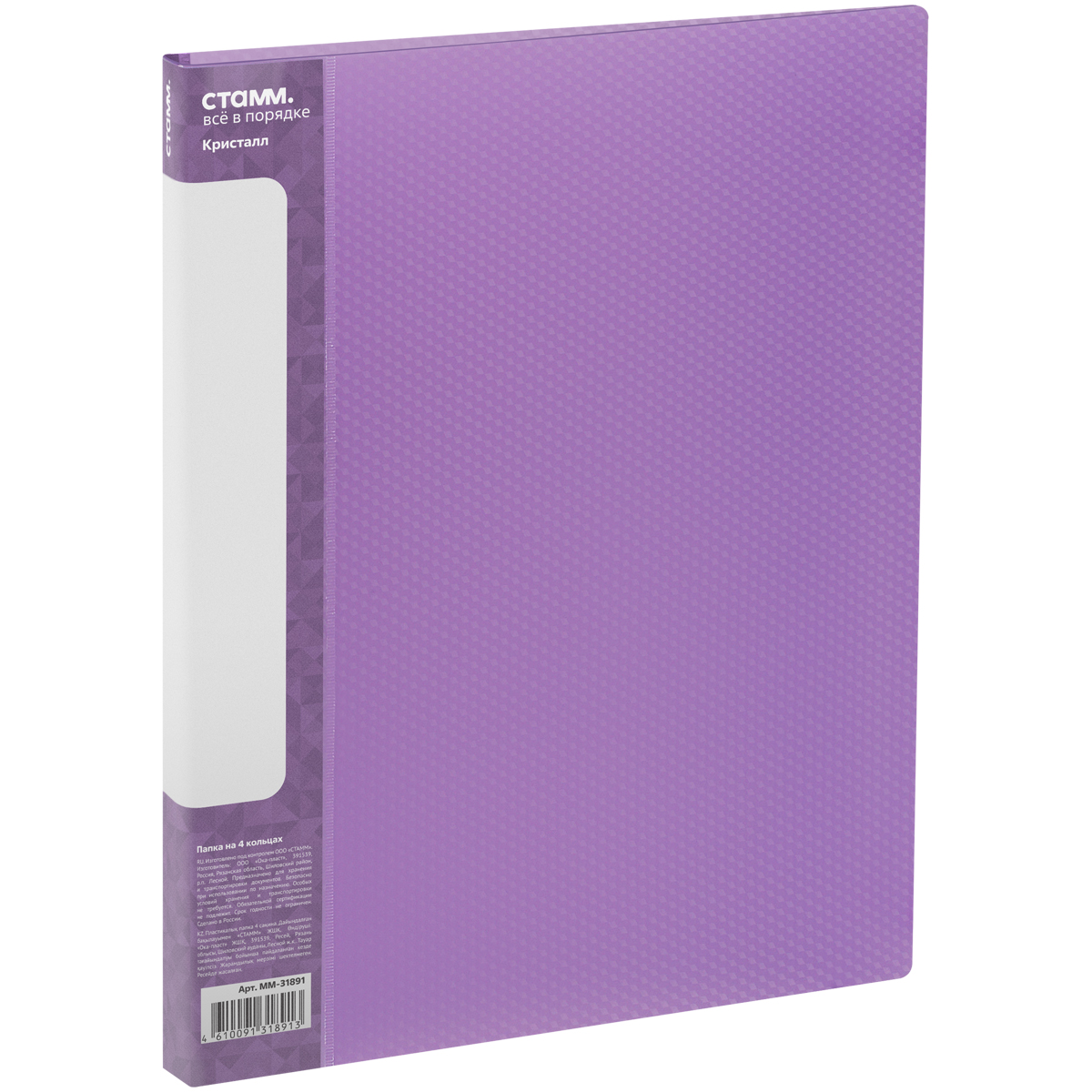 Папка на 4 кольцах СТАММ "Кристалл" А4, 25мм, 700мкм, пластик, фиолетовая
