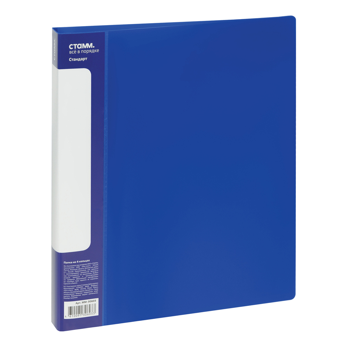Папка на 4 кольцах СТАММ "Стандарт" А4, 25мм, 700мкм, пластик, синяя