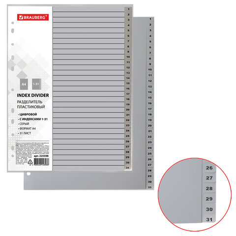 Разделитель пластиковый BRAUBERG, А4, 31 лист, цифровой 1-31, оглавление, серый, Россия, 225598