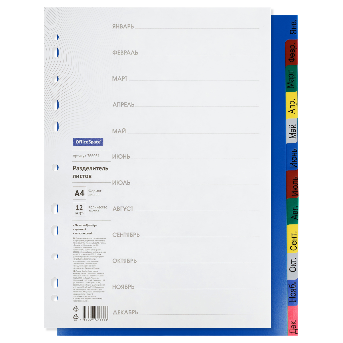 Разделитель листов OfficeSpace А4, 12 листов, Январь-Декабрь, цветной, пластиковый
