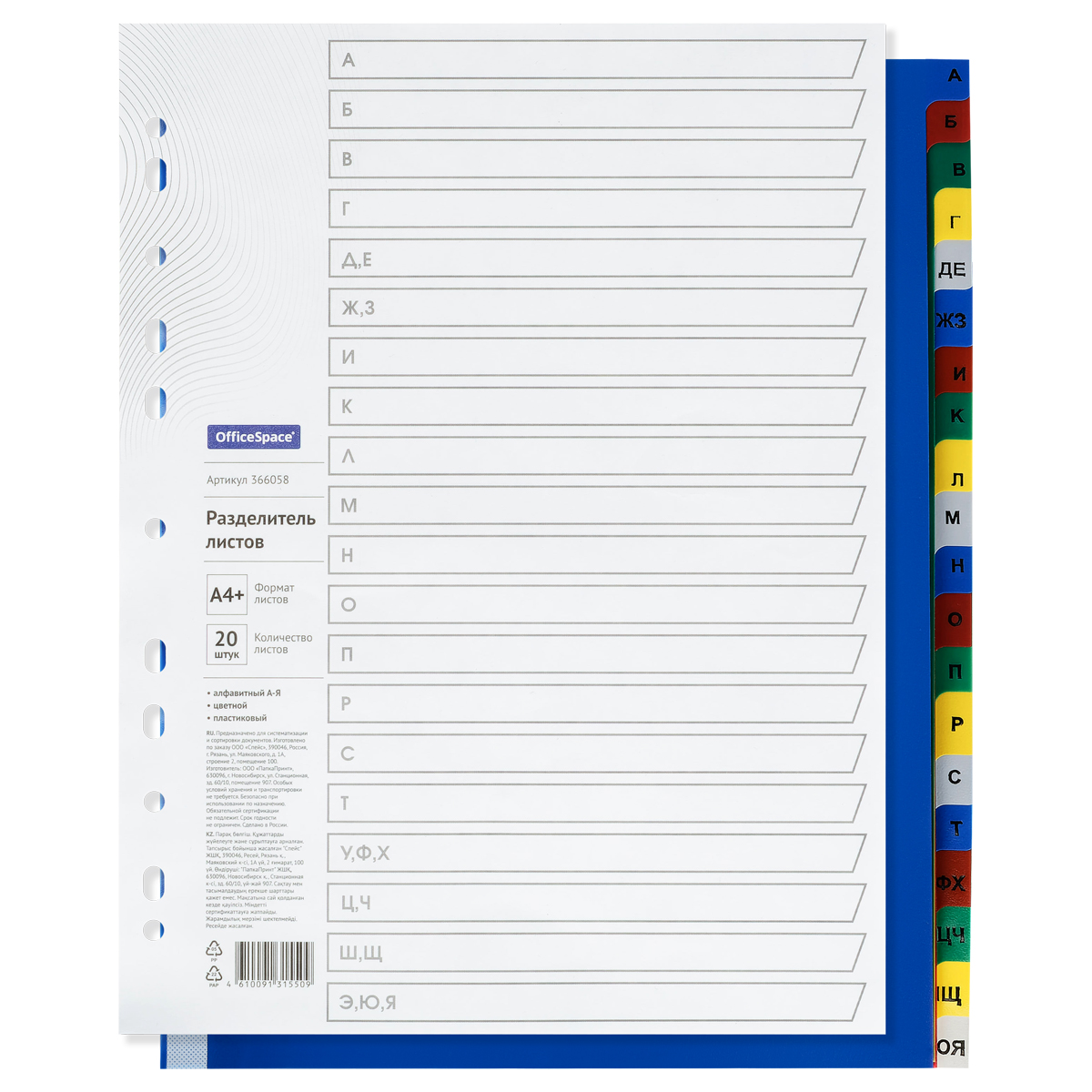 Разделитель листов OfficeSpace А4+, 20 листов, алфавитный А-Я, цветной, пластиковый
