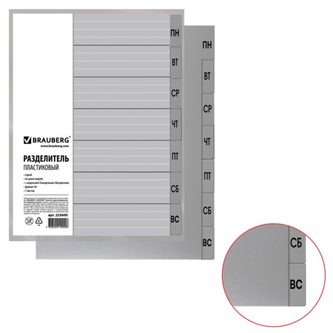 Разделитель пластиковый BRAUBERG, А4, 7 листов, по дням Пнд-Вск, оглавление, серый, РОССИЯ, 225600