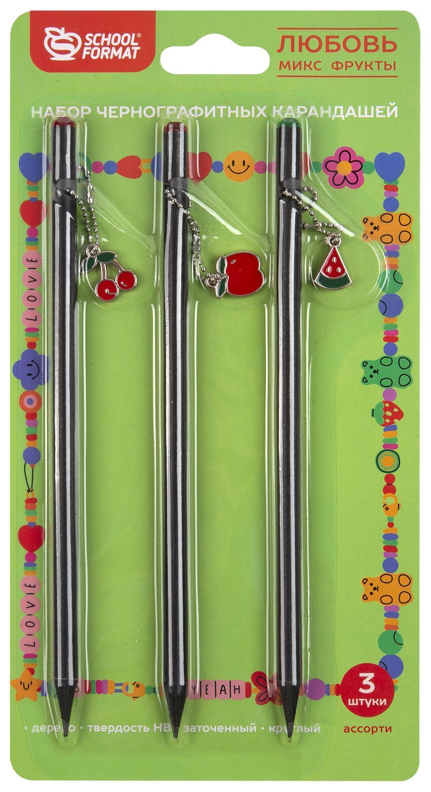 Набор чернографитных карандашей, корпус дерев. Schoolformat ЛЮБОВЬ. ФРУКТЫ 3 шт HB заточенный круглый блист. упак. с европодвесом подвеска