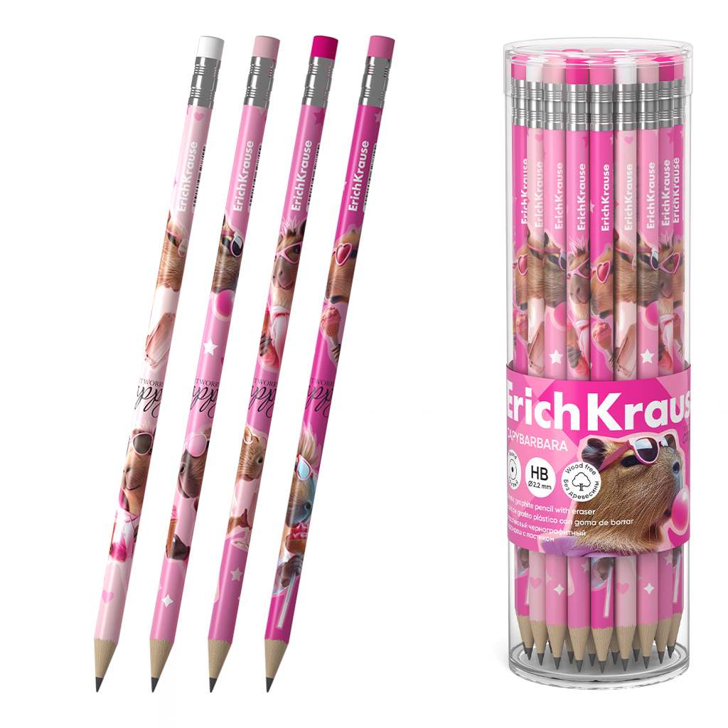 Чернографитный карандаш пластиковый ErichKrause CapyBarbara, круглый, с ластиком, НВ (в тубусе по 42 штуки)