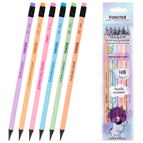 Набор карандашей чернографитных с мотивирующей надписью FUNSTER (ФАНСТЕР) FUNNY NOTES PSTL, 6 штук, HB, с ластиком, 182041