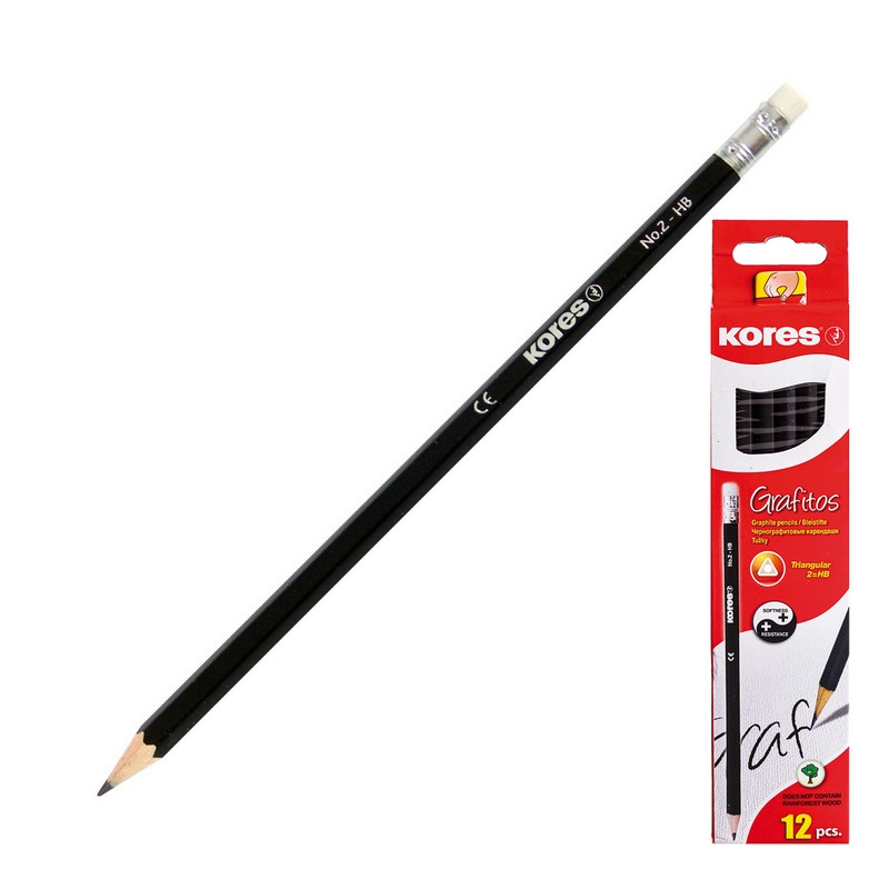 Карандаш чернографитный Kores в черном шестигранном деревянном корпусе. Простые карандаши с ластиком поставляются заточенными. Твердость грифеля - HB. Высококачественный и прочный, грифель не сломается даже при падении и ударе. Длина карандаша - 185 мм.