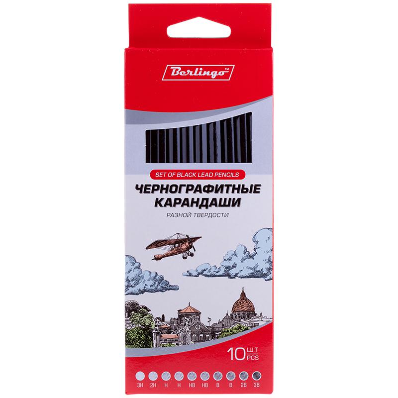 Набор из 10 чернографитных карандашей из липы, с заточкой разной твердости. Подходит для черчения и рисования. Диаметр стержня 2мм, твердость 3H-3B, шестигранной формы, с логотипом на корпусе. Трехцветная окраска корпуса. Отпускается только упаковкой в картонную коробку с европодвесом.