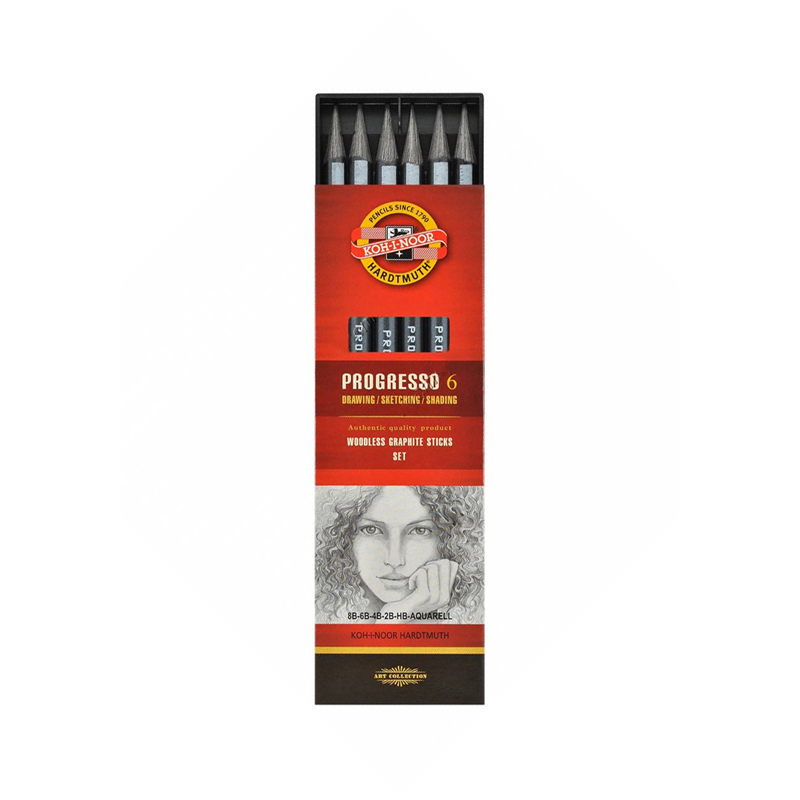Карандаши Progresso - это карандаши, которые состоят только из толстого грифеля, покрытого лаком. Точатся обычными точилками, грифель яркий и мягкий. Карандаши не требуют сильного надавливания, а также позволяют рисовать всей заточенной поверхностью карандаша. Набор цельнографитных карандашей Progresso включает в себя карандаши 8В, 6В, 4В, 2В, НВ и акварельный.