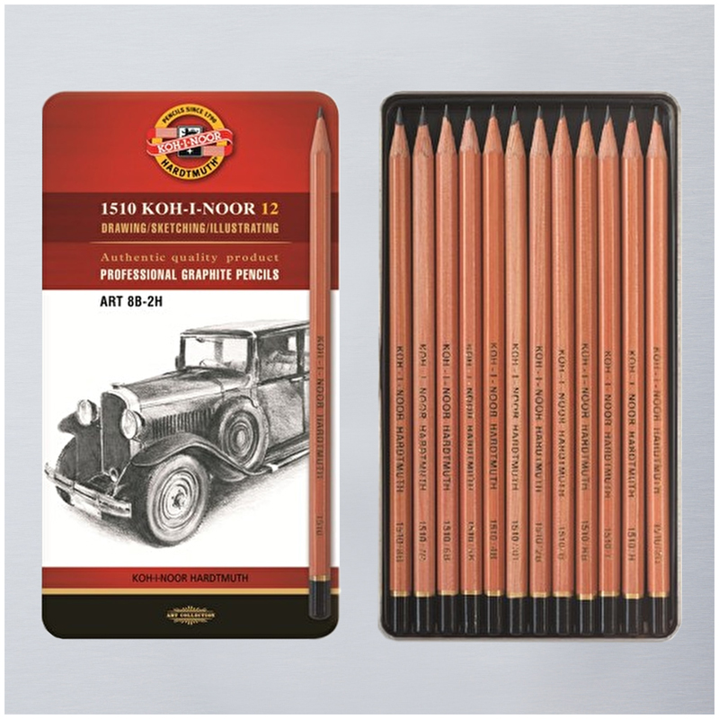 Набор карандашей ч/г Koh-I-Noor "1512", 8B-2H, 12шт, металл.пенал, с неокрашенным корпусом