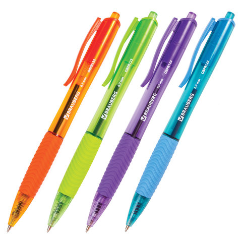 Шариковая масляная автоматическая с грипом BRAUBERG "Fruity RD" - яркая и функциональная ручка для работы и учебы! Имеет круглый корпус из ассорти цветов с печатью и резиновым грипом в зоне захвата для удобства письма. Сменный стержень длиной 111 мм с игольчатым наконечником позволит использовать ручку максимально долго. Диаметр пишущего узла, равный 0,7 мм, создает тонкую линию письма, равную 0,35 мм. Специальные масляные чернила синего цвета ультрапониженной вязкости и надежный пишущий узел обеспечивают непревзойденно мягкое и комфортное письмо.