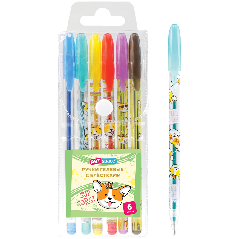 Набор гелевых ручек с глиттером, 6 цв., цвет чернил — ассорти, в блистере с ероподвесом 17,5х6,6х1,5 мм. Длина ручки с колпачком 149 мм, без колпачка 140 мм, длина стержня 130 мм. Диаметр корпуса 8 мм. Длина письма 1 ручки 250 - 300 м. Перед использованием рекомендовано встряхнуть ручку вниз пишущим узлом.