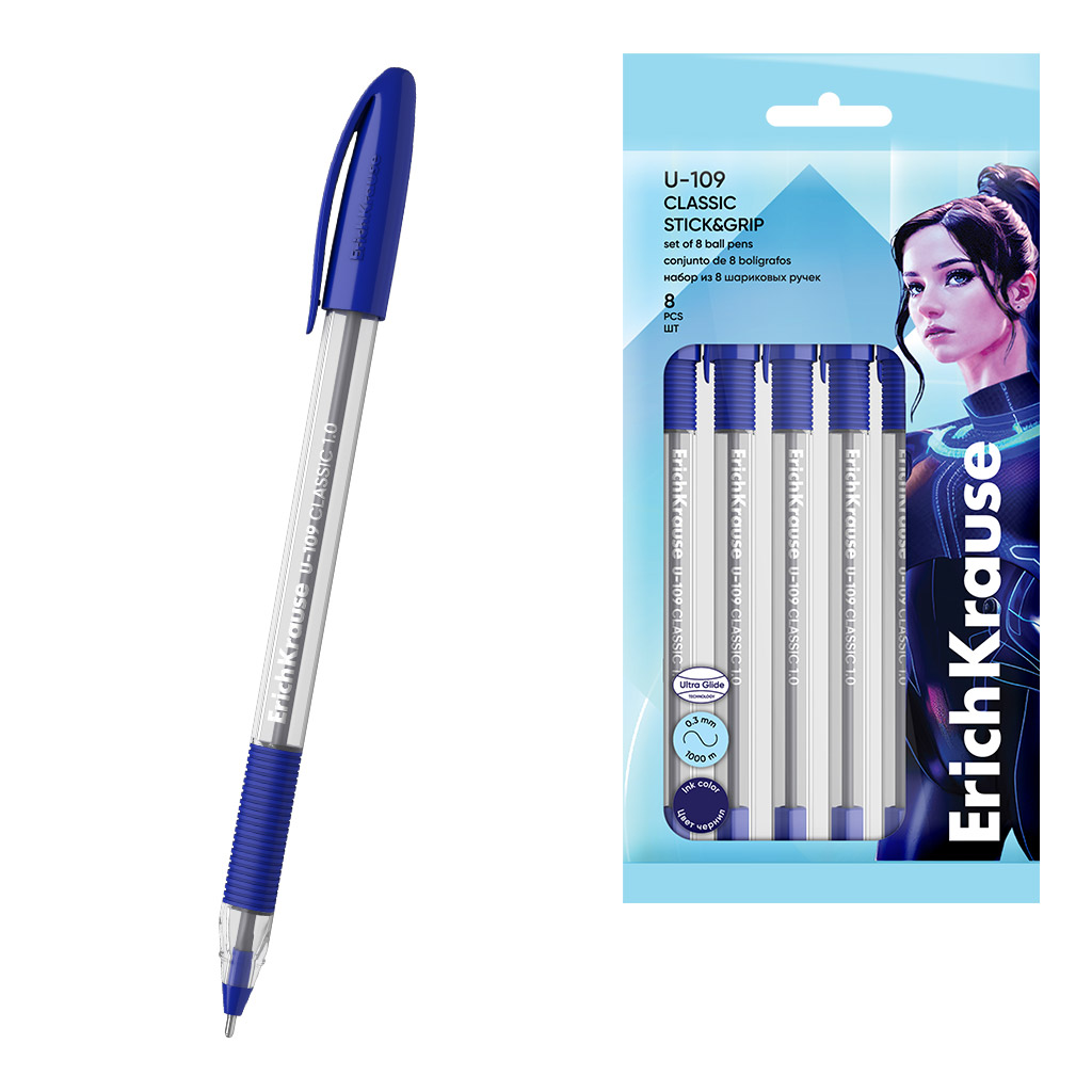 Набор из 8 ручек шариковых ErichKrause U-109 Stick&Grip Classic 1.0, Ultra Glide Technology, цвет чернил синий (в пакете)
