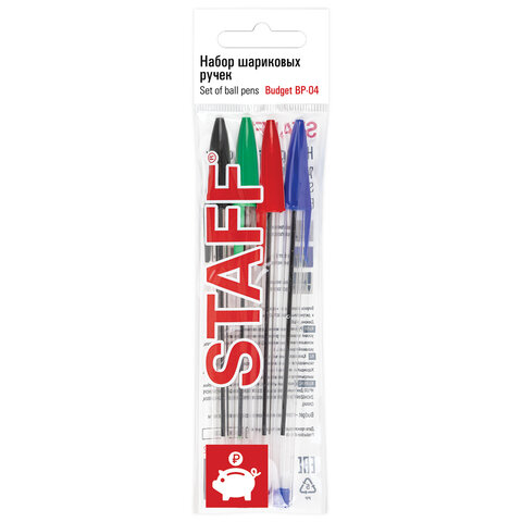 Набор шариковых ручек STAFF "Basic Budget BP-04" идеален для ежедневного использования. Ручки имеют прозрачный шестигранный корпус. Детали выполнены в цвет чернил. Длина корпуса 13,5 см. Диаметр пишущего узла 1 мм создает ровную линию письма, равную 0,5 мм. В наборе 4 цвета: синий, чёрный, красный, зеленый.Это товар эконом-сегмента, поэтому он отличается привлекательной ценой. Товар обладает базовым набором характеристик и простой упаковкой, при этом полностью соответствует основным требованиям потребителей.