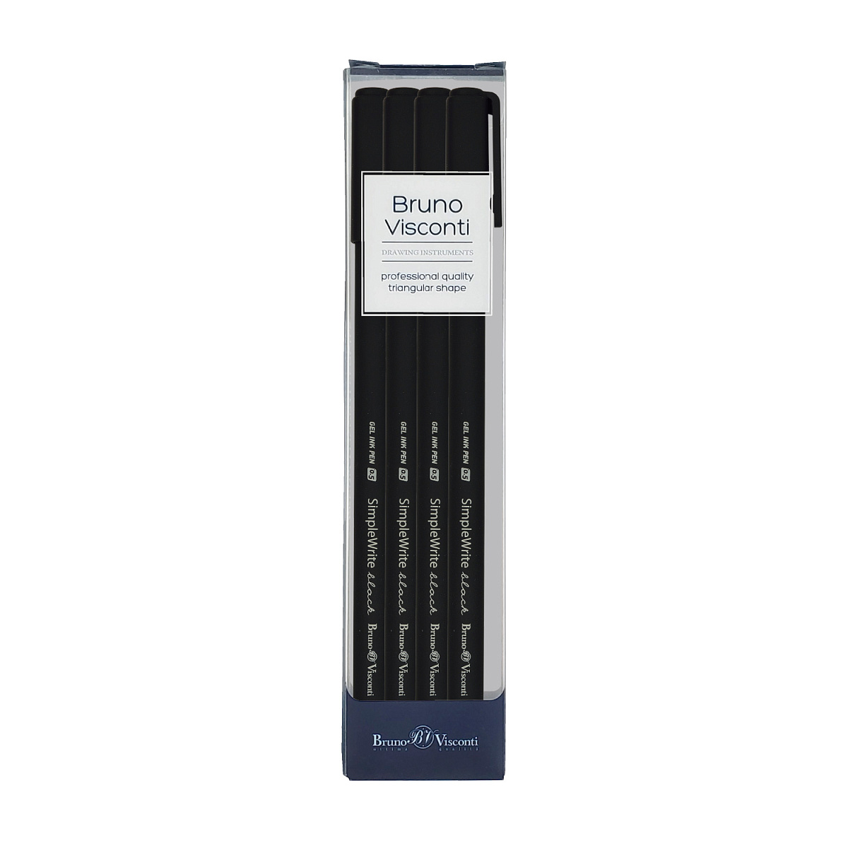 Набор из 4-х ручек «SimpleWrite. Black» для школы и офиса от ТМ «Bruno Visconti». Гелевые ручки серии «SimpleWrite» идеальны для тонкого письма благодаря высокому качеству производства. Дизайн корпуса выдержан в строгом офисном стиле: одноцветный черный корпус и колпачок в тон выполнены из матового пластика. Тактильно приятная поверхность ручек при письме создает антискользящий эффект, снижая нагрузку на кисть руки. В стержнях используются качественные японские гелевые чернила синего цвета. Тонкий пишущий узел 0.5 мм гарантирует четкие, непрерывные линии на бумаге любого типа. Защитный колпачок с клип-зажимом удобно фиксировать в кармане, пенале или отделении ежедневника.