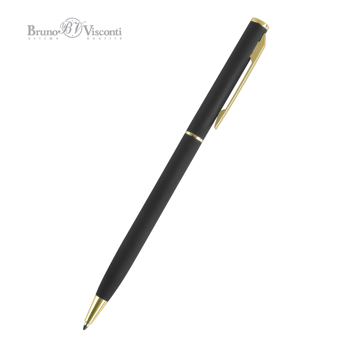 Маленькая автоматическая металлическая ручка BrunoVisconti серии «PALERMO» черного цвета с золотой фурнитурой порадует любителей всего изящного и утонченного. Покрытие корпуса Soft Touch гарантирует дополнительный комфорт в работе с ней. Стержень легко выдвигается благодаря поворотному механизму. Синие пигментные чернила DOKUMENTAL(Германия) и пишущий узел Premec (Швейцария) – обеспечивают качественное и мягкое письмо.