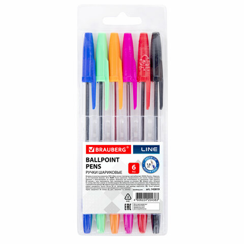 Ручки шариковые BRAUBERG, НАБОР 6 шт., АССОРТИ, "Line", корпус прозрачный, узел 1 мм, линия письма 0,5 мм, BP115