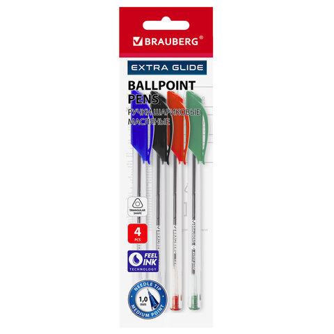Ручки шариковые масляные BRAUBERG, НАБОР 4 шт., АССОРТИ, "Extra Glide", узел 1 мм, линия письма 0,5 мм, OBP236