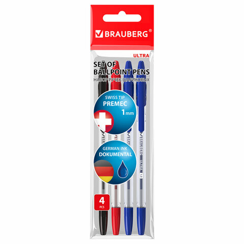 Ручки шариковые BRAUBERG "ULTRA", НАБОР 4 штуки (2 синих, 1 черная, 1 красная), узел 1 мм, 143569