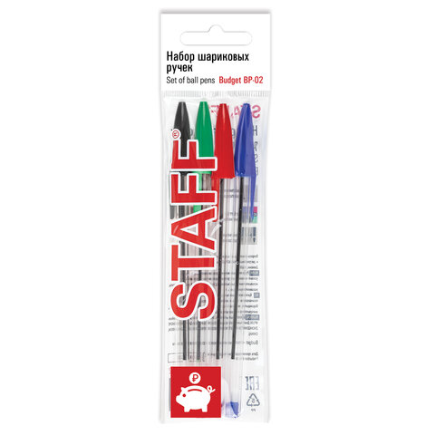 Ручки шариковые НАБОР 4 ЦВЕТА STAFF Basic Budget BP-02, письмо 500 м, длина корпуса 13,5 см, линия письма 0,5 мм, 143762