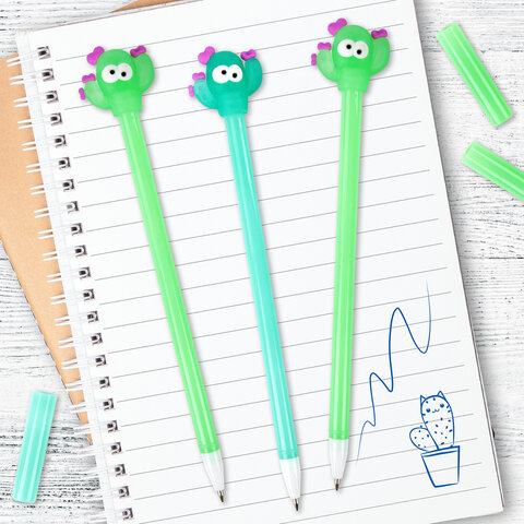 Ручка с топпером шариковая ЮНЛАНДИЯ "Цветущий кактус", корпус ассорти, СИНЯЯ, пишущий узел 0,7 мм, 143781
