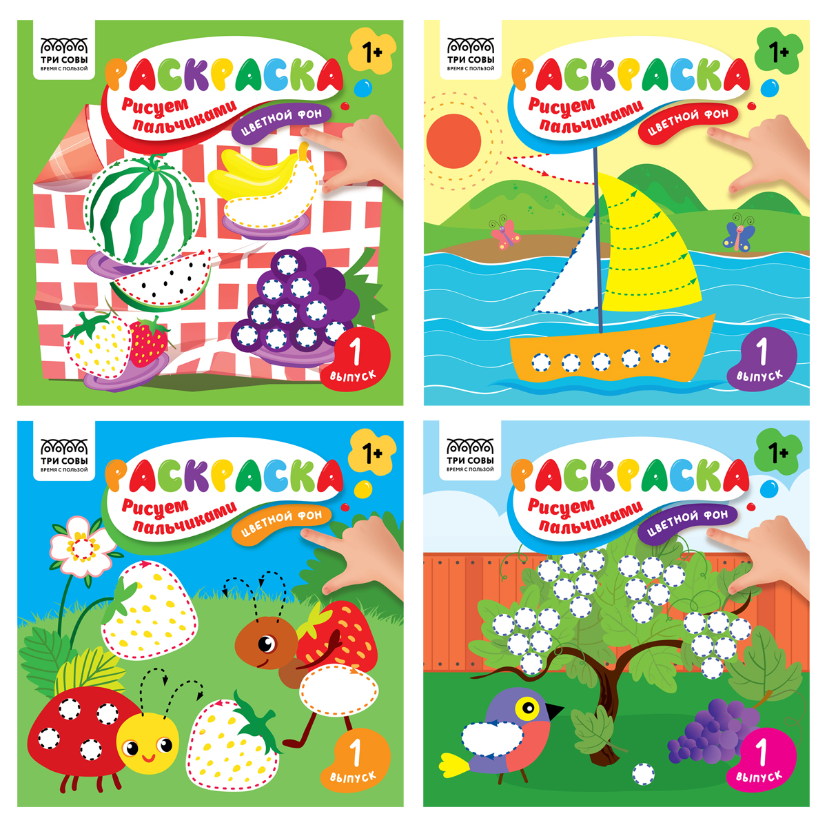 Раскраска пальчиковая с цв. фоном 190*190, 8 стр., ТРИ СОВЫ "Рисуем пальчиками. Выпуск №1"