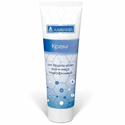 Крем для защиты кожи рук и лица гидрофильный АЛИРАНТА. Эффектно защищает кожу от водонерастворимых вредных производственных факторов:• Лаков, красок, смол,• нефтепродуктов,• технических масел,• смазочных веществ,• угольной и металлической пыли,• органических растворителей,• сажи, копоти, графита,• клея, силиконов, стекловолокна. Активные компоненты: экстракт череды, экстракт алоэ, аллантоин, витаминный комплекс А+Е. Предупреждает проникновение загрязняющих веществ, оказывает омолаживающее, антиоксидантное и противовоспалительное воздействие на кожу и облегчает ее очистку. Подходит для нежной и чувствительной кожи!Состав: вода, каолин, цетеариловый спирт, масло вазелиновое, глицерил стеарат, ПЭГ-100 стеарат, этилгексилстеарат, глицерин, стеариновая кислота, феноксиэтанол, глицерил лаурат, полиакрилат натрия, экстракт череды, экстракт алоэ, парфюмерная композиция, ксантановая камедь, витамин Е, аллантоин, витамин А.