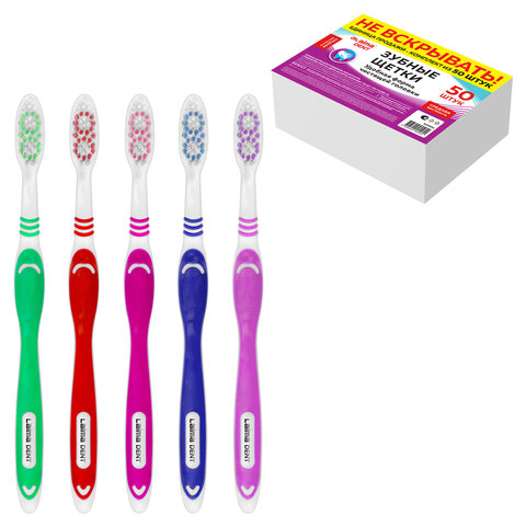 Зубная щетка средней жесткости (ассорти 4 цвета), КОМПЛЕКТ 50 шт., LAIMA DENT, 609691