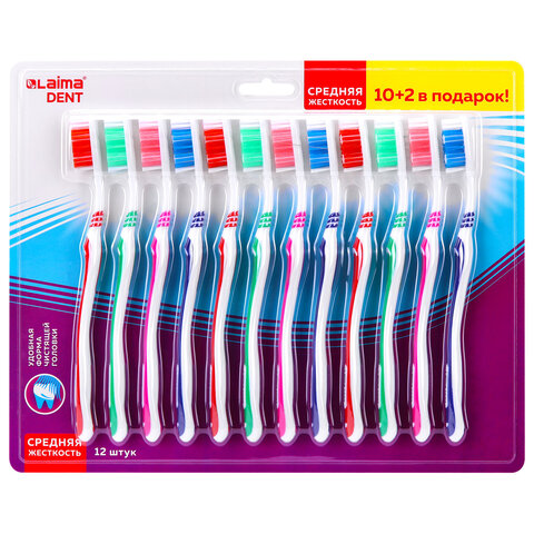 Зубная щетка средней жесткости, КОМПЛЕКТ 12 шт. (10 + 2 в подарок), LAIMA DENT, 609689