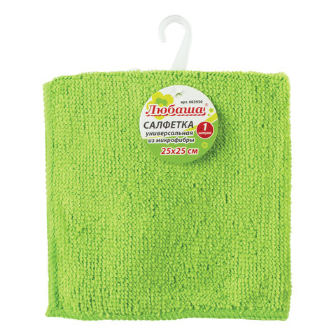 Универсальная салфетка ЛЮБАША из микрофибры применяется для сухой и влажной уборки. Отлично впитывает влагу, масло, грязь. Не оставляет разводов и ворса. Не царапает деликатные поверхности, такие как экраны и ЖК-мониторы, стекло, полированную мебель. Повышенная плотность 180 г/м2 обеспечивает высокую износостойкость и экономичный расход. Размер - 25х25 см. Сохраняет свои свойства даже при многократном применении. Поставляется в пакете с подвесом. Цвет - зеленый.