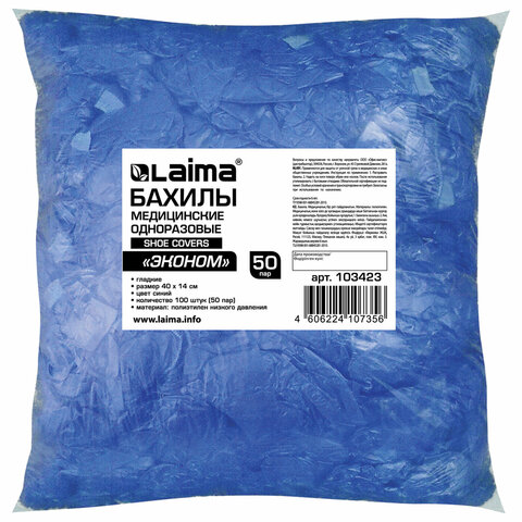 Бахилы КОМПЛЕКТ 100 штук (50 пар) в упаковке, ЭКОНОМ, размер 39х15 см, 20 мкм, 2,5 г, ПНД, ЛАЙМА, 103423