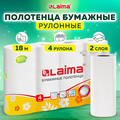 Полотенца бумажные бытовые, спайка 4 шт., 2-х слойные (4х18 м), ЛАЙМА, 22х23 см, белые, 128725