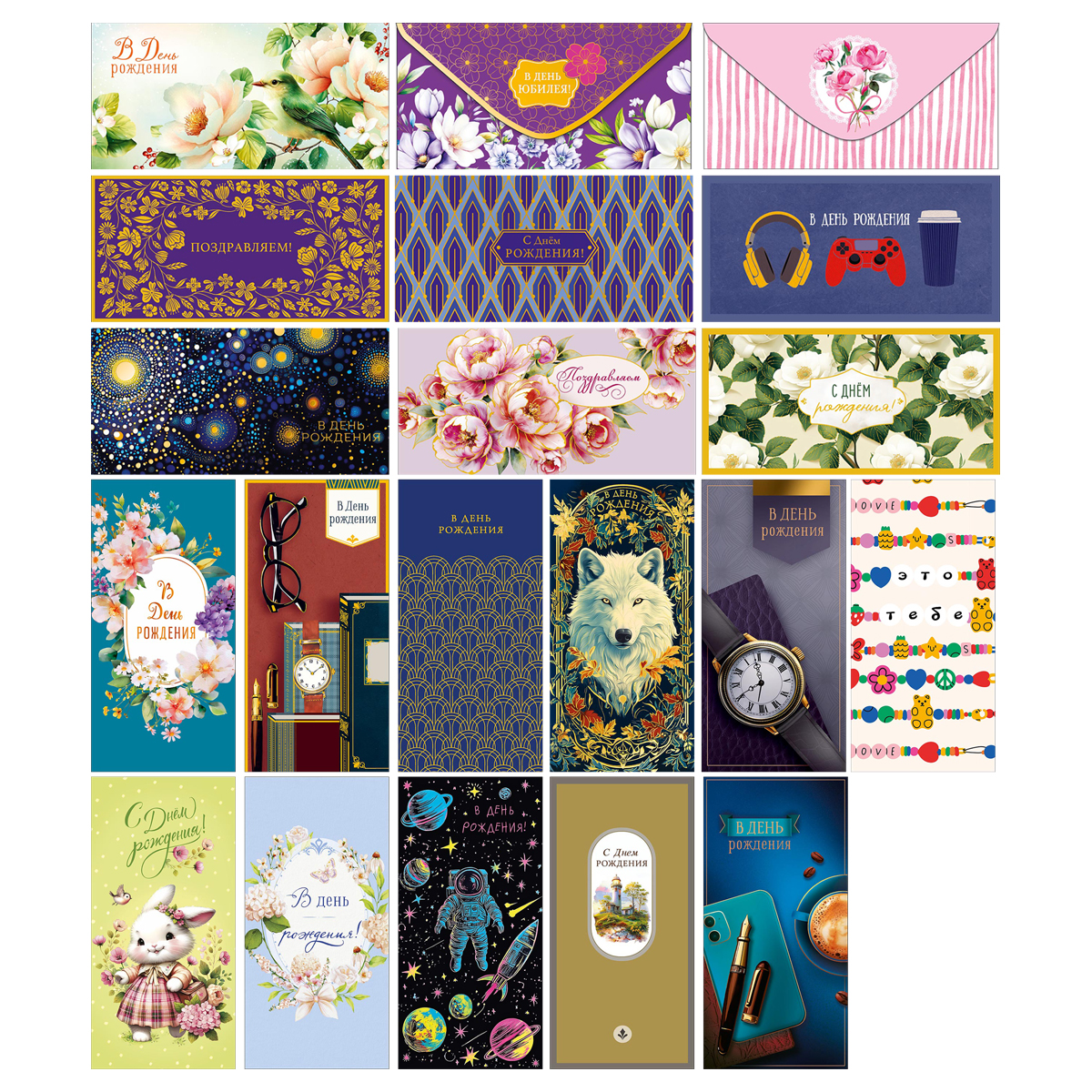 Красивая упаковка для денежных подарков. Конверты для денег с различными надписями на лицевой стороне. Отделка: фольга. Фасовка 20 дизайнов по 5 шт. Размер изделия: 167*83 мм.