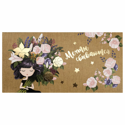 Конверт для денег ЗОЛОТАЯ СКАЗКА предназначен для вручения денежного подарка на торжественных мероприятиях и праздниках. Конверт с надписью "МЕЧТЫ СБЫВАЮТСЯ" изготовлен из высококачественного картона плотностью 215 г/м2. Выполнен в бежевом цвете с изображением девушки и цветочным принтом. Отделка - фольга. Размер - 166х82 мм.