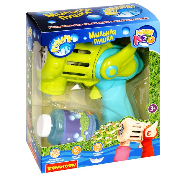 Генератор мыльных пузырей от Bondibon – супер ПУШКА, поёт, светится, пускает цветные пузыри мощным потоком и дарит море радости! Классный дизайн с крылышками не оставит никого равнодушным! Мыльные пузыри - одна из любимых игрушек для детей. Что может быть веселее, чем устроить мыльное шоу с пузырями или перестрелки из водных пистолетов на улице, даче или в бассейне? Дети не только развлекаются, в процессе такой игры у ребенка совершенствуется зрительное восприятие, развиваются социальные навыки и зрительно-моторная координация. Работает мыльная пушка очень просто. Налейте мыльный раствор в тарелочку. Погрузите стволы пушки в раствор. Поднимите пушку и нажмите спусковой крючок. Поднимите пушку и нажмите кнопку для старта. Запускайте пузыри с подсветкой и под музыку! В комплект входит: - зелено-голубой пистолет - мыльный раствор 130мл - тарелочка Бластер работает от 3 батареек типа АА. Батарейки в набор не входят. Серия Наше Лето. Возраст 3+