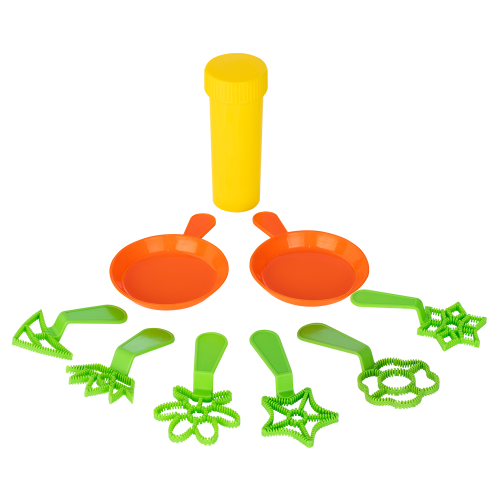 Мини набор для пускания мыльных пузырей с раствором. В набор входит баночка с раствором пузырей 50 мл, 6 формочек для выдувания пузырей и 2 тарелочки для раствора.